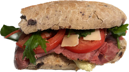 Olivenbrot mit Roastbeef, Rucola, Parmesan