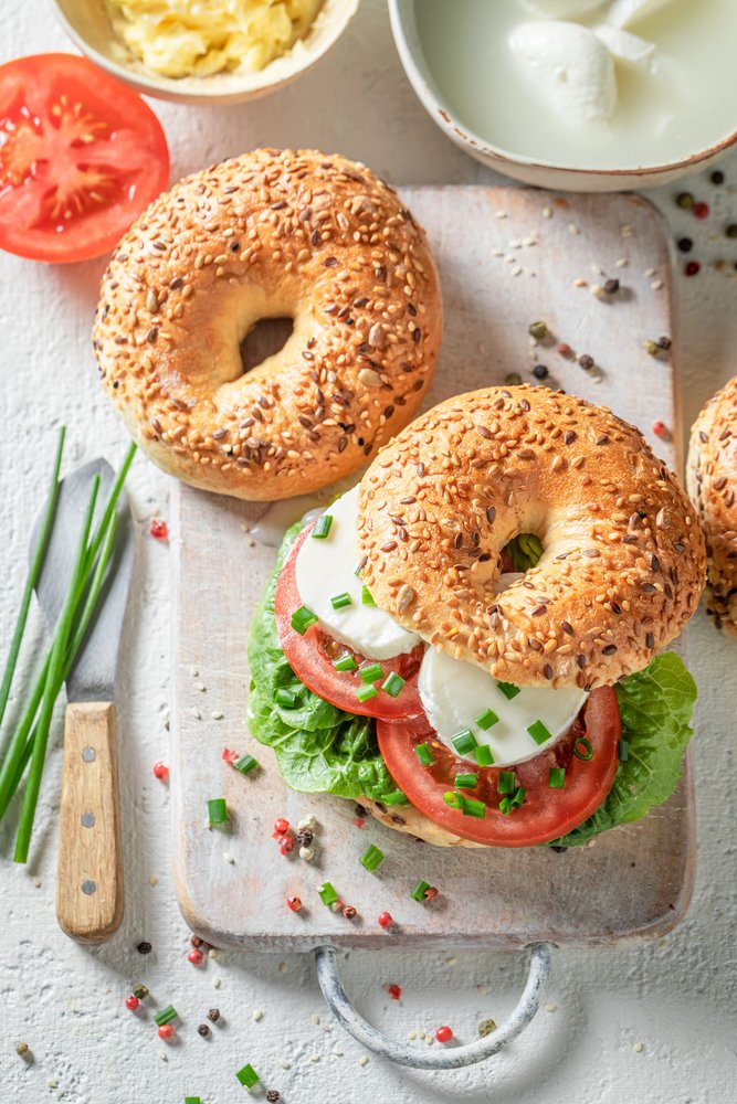 Bagel mit Serrano, Tomaten, roten Zwiebeln und Mozarella