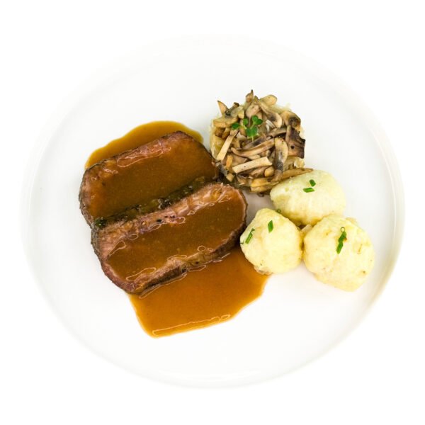 Sauerbraten, Klöße und Sauerkraut mit Pilzen