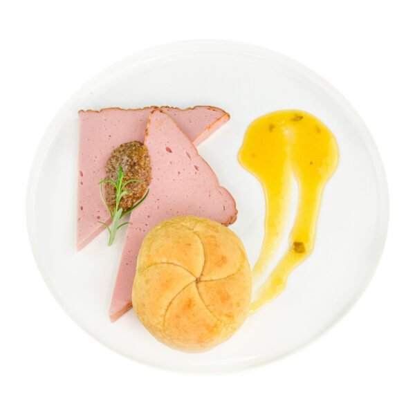 Leberkäse, mit süßem Senf und Semmel