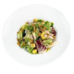 Gegrillte Hähnchenfiletstreifen, Mango, blaue Weintrauben, Mandelstifte und bunter Salatmix
