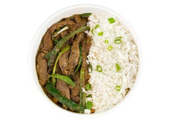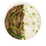 Gebratene Rinderstreifen mit grüner Paprika und Jasminreis